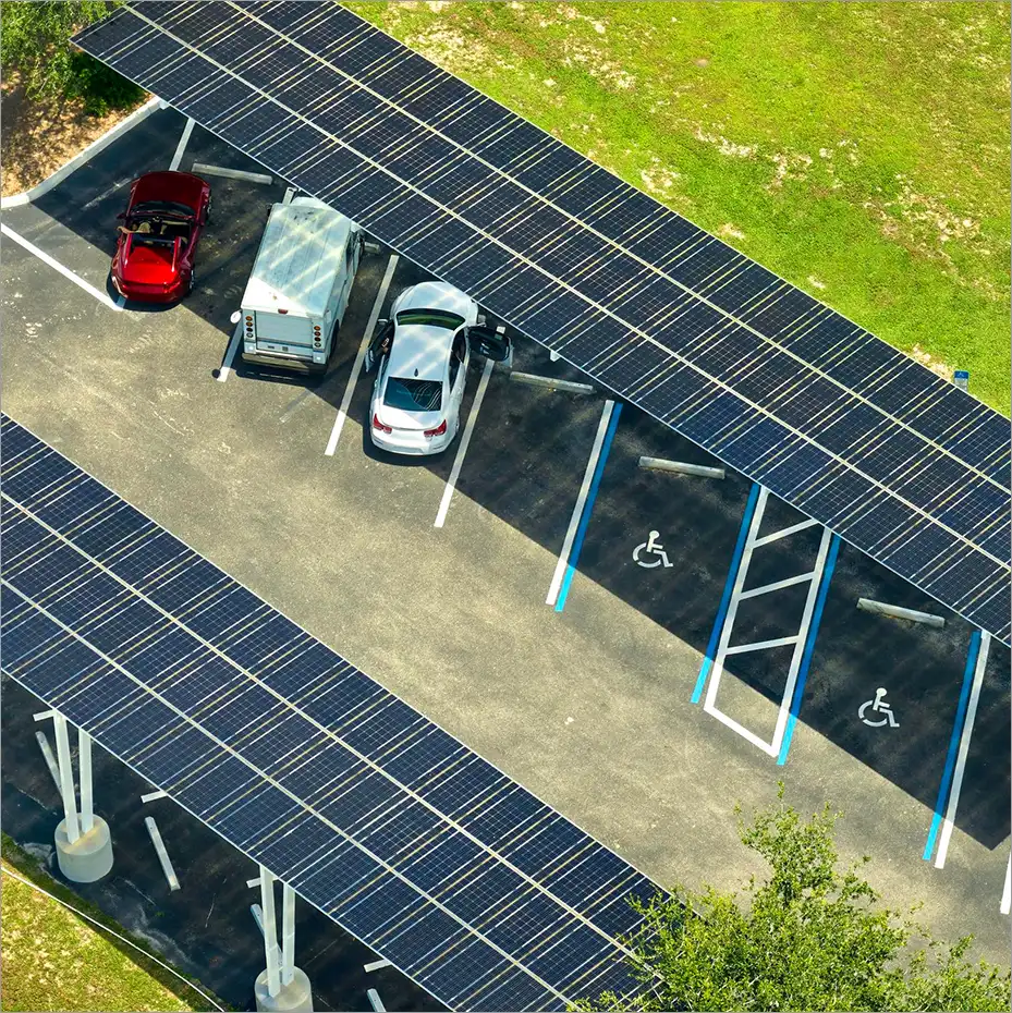Überdachte Parkplätze ermöglichen eine Doppelnutzung der Fläche: Sie produzieren Solarstrom und bieten gleichzeitig Witterungsschutz für Fahrzeuge.