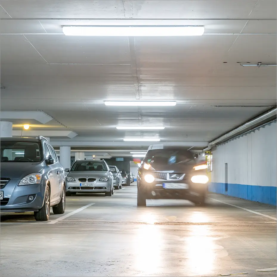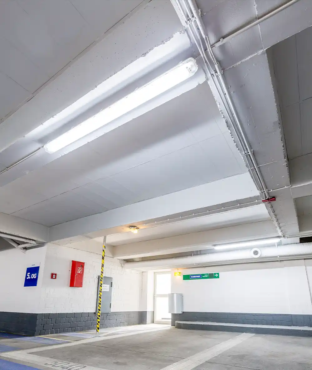 Unsere Leuchten bieten eine präzise Lichtverteilung, hohe Schlagfestigkeit und optimale Ausleuchtung selbst bei schlechten Wetterverhältnissen oder engen Parkhaussituationen. Dank modernem Thermomanagement, langlebigen LED-Chips und robusten Gehäusen eignen sich die Systeme ideal für den dauerhaften Außen- und Innenbetrieb.