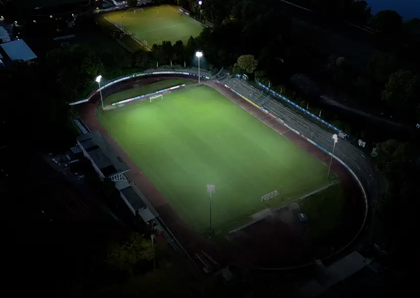 Auch Gebäudefassaden, Dächer, Sportanlagen und LED-Flutlichtmasten profitieren von regelmäßigen Drohnenkontrollen. Risse, fehlerhafte Befestigungen, Korrosionsstellen oder lose Bauteile lassen sich aus der Luft schnell und sicher erkennen.